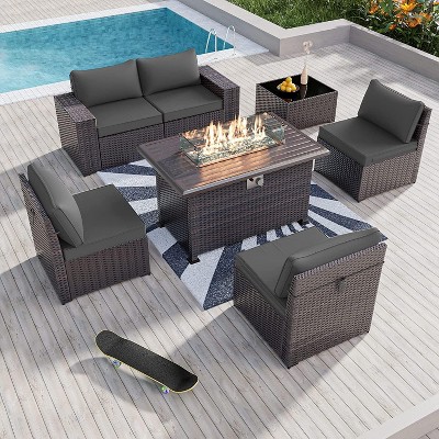 ALAULM 8 Pieces Outdoor Patio Furniture Set with 43" Gas Propane Fire Pit Table PE Wicker Rattan Sectional Sofa Patio Conversation Sets,Grey