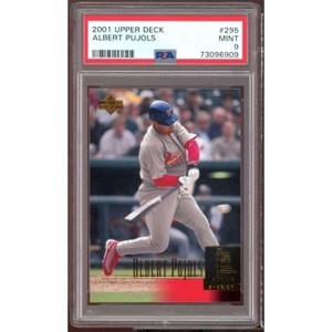 This rookie card of future Hall of Famer Albert Pujols is from the 2001 Upper Deck set, graded a PSA 9 for its pristine condition and iconic image of Pujols swinging for the fences, a valuable addition to any baseball card collection.