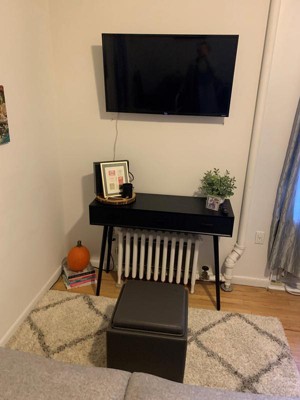The table is exactly what I needed for this awkward space. The drawers are a nice size for extra storage. Easy to assemble (just screw in the legs). Dark black color is accurate. The drawers are a little difficult to pull out if too much weight is inside, and the legs are a little wobbly, but that may be due to uneven flooring (easily fixed with pads underneath one of the legs).