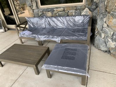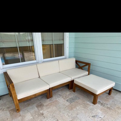 Q: What is the total length and width of the couch? I realize it gives by piece, but I don't know which piece is what. Looking to find out if the three piece seating? ottoman will fit in my patio space.