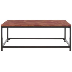 Give your decor an industrial farmhouse edge with this Alec Coffee Table. Alecs smooth wood surface in a distressed maroon finish is the perfect counterpoint to its open metal frame. For an eclectic curated look, pair Alec with more traditional accent accessories. Care Instructions: Dust regularly with a soft, dry cloth. Never use oiled or treated cloths on lacquered finishes. Some finishes can be wiped with a damp (not wet) cloth, followed at once by rubbing with a dry cloth to remove fingerprints and smudges. For persistent spots, gently clean with a soft cloth and a solution of water and mild soap, make sure to wipe dry. Use adhesive felt pads, coasters and placemats to protect your furniture.