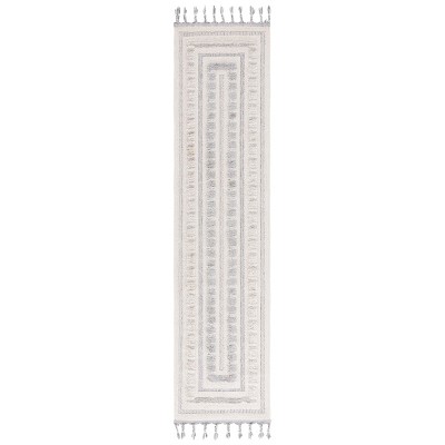 This 2' X 8' runner rug features a chic modern style that seamlessly integrates with contemporary decor. Its versatile ivory and grey palette is complemented by a pattern that adds texture and visual interest to your floor. The design displays a harmonious blend of distressed grey hues bordering a central ivory field with a raised geometric motif, which provides a subtle, elegant contrast ideal for hallways, entryways, or any long, narrow space in need of an aesthetic uplift.