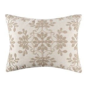 The Embroidered Floral decorative pillow perfectly complements the Levtex Home Alessio Beige bedding collection. This pillow is sized at 14 x 18in. and features a beautiful crewel stitched floral design in beige on a cream ground. The color palette makes this a versatile accessory for your bed, couch or favorite chair. The pillow comes pre-filled with a soft, luxurious feather inner.
