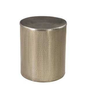 A modern artful accent with a round metal drum end table finished with hammered details and a silver metallic tone. It provides plenty of space on top which opens up for storage of your favorite books and blankets.