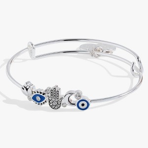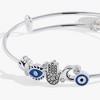 Manifest protective energy with this protection expandable wire bangle. Said to ward off negativity, the hamsa hand on this bracelet is set with other symbols of intuition and resilience: a moon, a lotus flower and two evil eyes, all accented with clear crystals. Make space for good things to come your way. The expandable design fits most wrist sizes comfortably, making it an accessible way to carry meaningful symbolism throughout your day. Perfect for layering or wearing alone, this bangle combines spiritual intention with everyday wearability.