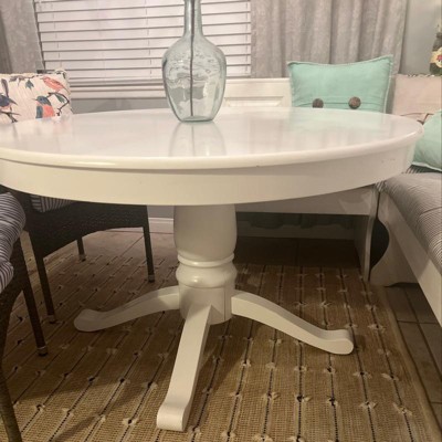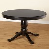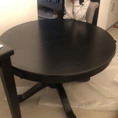 The Alexa Pedestal Round Table from Buylateral is a traditional look with an updated modern sleek finish. Well-crafted and very sturdy, this table features a substantial solid rubberwood carved pedestal based, seating 4 comfortably. The black finish gives a new modern look to any dining room or kitchen space complementing most room interiors.