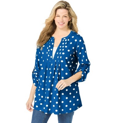 Alfred Dunner Womens Floral Border Embroidered Split Neck Top, Denim, Size L