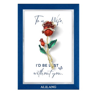 - Jewelry, Card, & Envelope: A beautiful red rose flower pin brooch paired with a heartfelt message printed on a white card. Both fully wrapped & packed in a navy blue envelope with a front display cutout.