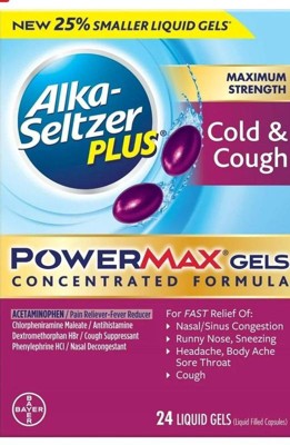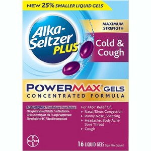 Alka-Seltzer Plus PowerMax Cold & Cough Liquid Gels provide strong relief for cold and cough symptoms in a 16-count package. Each liquid gel works quickly to ease cough, sore throat, fever, and congestion, while reducing body aches. The PowerMax concentrated formula ensures faster absorption and maximum strength results. Easy to swallow and convenient, these liquid gels are practical for home, office, or travel use. Trusted for reliable symptom care, Alka-Seltzer Plus offers dependable multi-symptom relief in a compact format that supports recovery during seasonal illness.