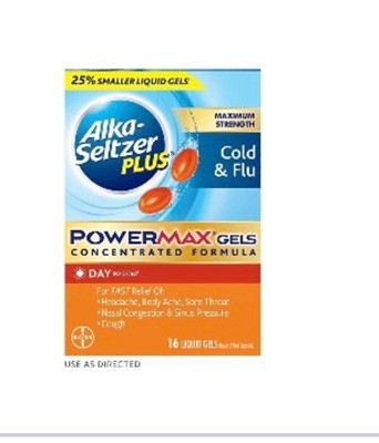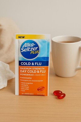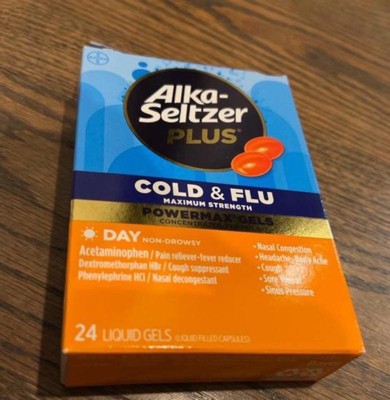 Alka-Seltzer Plus PowerMax Cold & Flu Day Liquid Gels provide fast, powerful relief in a compact form. Designed to combat your toughest cold and flu symptoms during the day, this formula helps relieve nasal congestion, sinus pressure, headache, body aches, and fever. PowerMax technology concentrates powerful medicine into a 25% smaller liquid gel compared to standard capsules, making it easier to swallow while delivering fast-acting relief. Perfect for busy days when you can't afford to slow down. Stay alert and in control with non-drowsy daytime relief that works when you need it most.