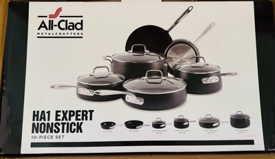 - The All-Clad HA1 Expert Hard Anodized Nonstick cookware set includes a 8 and 10 inch fry pan, 2.5 quart and 3.5 quart sauce pan with lids, 4 quart sauté pan with lid, and 8 quart stockpot with lid.