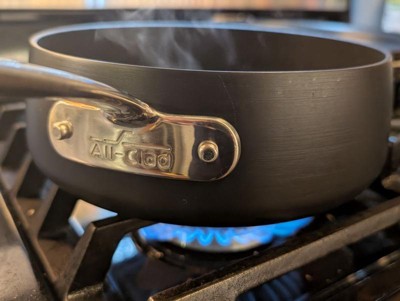 - The All-Clad HA1 Expert Hard Anodized Nonstick 2.5 quart Saucepan has high, straight sides and is ideal for smaller portions. The smaller surface area makes it ideal for techniques like boiling, blanching and reheating while holding heat and limiting evaporation.