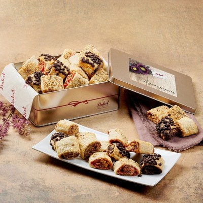 - FOOD GIFT BASKETS - THE MOST ADDICTIVE FILLED BOX EVER: Our reusable tin box is a great gift full of flavor. The gift is filled with the perfect bite-sized treats; 4 Flavors of Rugelah in Chocolate Chip, Raspberry, Cinnamon Sugar, and/or Apricot fillings are enrobed in the most delectable pastry dough. Gift features 2 lb. assorted Rugelah, simply addictive!