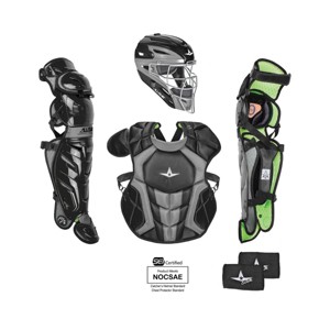 All Star Youth System7 Axis Pro Catching Kit Helmet: Fast drying and removable, washable, and replacable liner PRO TIP: Purchase an extra liner set for changing out between games, practice, or even innings I-BAR Vision cage for better sight lines and stength Secure mounting backplate straps Durable ABS shell extra thick in the forehead to withstand more abuse Fits head sides 6 1/4 - 7Chest Protector: Certified by SEI to meet NOCSAE standard for protection against commotio cordis Patent Pending chest panel for improved protection Wedged abs for improved blocking and ball control Moldable PE plates in the shoulders and throat Diamond vented back side for weight reduction and breathability Stainless steel matte black hardware Thinner, more form-fitting DeltaFlex harness for enhanced fit and comfort Diamond Vent Ports for weight reduction and breathability 14.5"" measured from clavicle to navalLeg Guards: LINQ Hinge system for insane mobility - these truly move and bend with you Single top strap remains in place and will not drop behind the back of the knee Wide and smooth knee for better pivoting and sliding Delta Flex Harness pre-crosses straps and hugs calf muscle for secure fit Repositionable knee pad - put the padding where you need it most Diamond Vent Ports for weight reduction and breathability Stainless Steel matte black hardwareAge Group 9-12