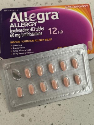 Allegra Allergy Tablets 60 mg are formulated to provide non-drowsy relief from common indoor and outdoor allergy symptoms, including sneezing, runny nose, itchy or watery eyes, and itching of the nose or throat. This over-the-counter antihistamine contains fexofenadine hydrochloride and is designed to work by blocking histamines that cause allergy symptoms. Allegra 60 mg provides up to 12 hours of symptom relief when taken as directed, making it suitable for daytime use without causing drowsiness for most users. The tablet form allows for convenient, consistent dosing. This 12-count package is ideal for short-term or seasonal allergy needs. Allegra Allergy Tablets are intended for adults and children as directed on the Drug Facts label and should be used only as instructed. Allegra offers a trusted option for effective, non-drowsy allergy symptom management.