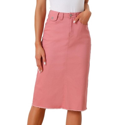Treat yourself to the classic feel of this denim skirt with a raw hem, and washed details. With slim fit and pencil style details, this knee-length skirt features classic five pockets, a frayed hem, comfy fabric, and a raw-cut hem for your cuteness. Perfectly pair it with your simple dots T-shirt or sandals to complete your fashion look. Knee Length, cute and comfortable, suitable for spring, and summer.
