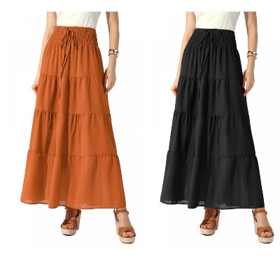 Boho Skirt, Smocked Waist, Tie Front, A-Line, Tiered Hem, Maxi Length, Package Includes: Skirt*2