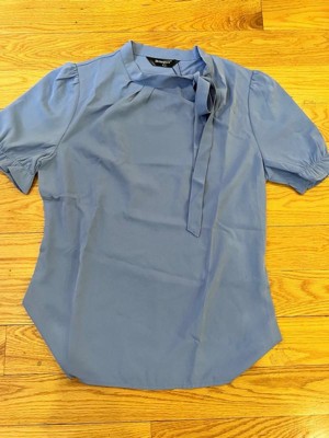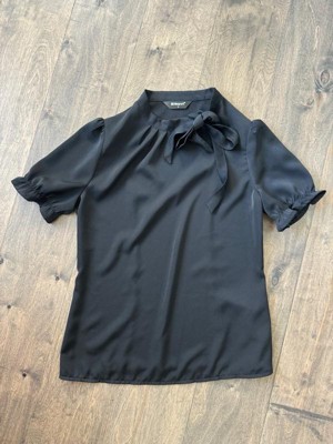 This regular-fit blouse will complement many body types to keep you looking great all day. The soft woven poly shapes a gathered neck and straight-cut silhouette, framed by puffy short sleeves with elastic cuffs. Your wardrobe is not complete without this elegant office shirt. Pair it with high-waist pants and heels for an easy, chic style. A sweet bow tie detail lends an elegant air to an everyday top.