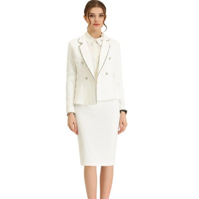 INSPIRE CHIC Women's Business Long Sleeve Notched Lapel Peplum Blazer Pencil Skirt Suit Set 2 Pcs Medium White Beige
