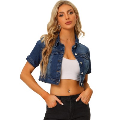 INSPIRE CHIC Women's Cap Sleeve Slim Fit Summer Open Front Crop Denim Jacket