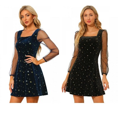 Choker V Neck, Back Keyhole with Button Closure, Long Sleeves with Elastic Cuffs, Stretchy Waist, Gilding Star Pattern, Above Knee, Fully Lined, Inelastic Fabric