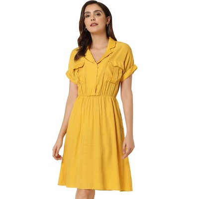 INSPIRE CHIC Women's Cotton Ruffled Cap Sleeve Tie Waist Button Casual Office Shirt Dress Medium Yellow