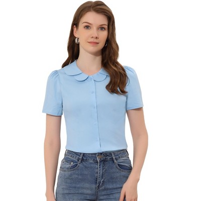 Fancy buttons and sweetly puff sleeves lend a lovely air to an everyday top. A Peter Pan collar band square neck tops this romantic short-sleeve blouse accompanied by fanciful pearls. A comfortable peasant top offers graceful style via its delicately square neck and decent silhouette. Cut from cotton and decorated with pretty beads, it has a regular fit with puff short sleeves and a square neck, finished with a Peter Pan collar. Great with cute skirts and sandals.