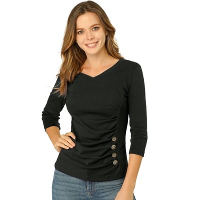 Show your feminine style with this ruched drape neck slim top. This long-sleeved pullover top is one of the must-have items in your wardrobe. The slim cut can show your charming silhouette, and the button decor adds a casual feel. Feel free to pair it with jeans and boots for a smart look. Day-to-Night, Weekend Gathering, Vacation, Office, School, Dating, etc.
