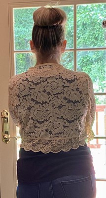 This cute little 3/4 sleeve, lacy, black shrug fits in all the right places and is super comfy! It is a short shrug in length and is true to size. It can be worn casually with a tank top and some jeans/shorts or over a dress to make it look really dressy. The floral lace throughout the shrug are very detailed and add some extra elegance to it. Very easy to hand wash and hang dry/lay flat. I would definitely recommend this as an item to add to a wardrobe to add something extra.