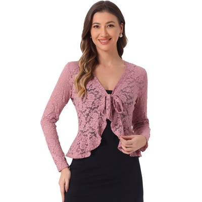 Add a bit of a feminine style to your look with this sheer floral lace shrug top, which features a 3/4 sleeve form, an open front, and sheer floral lace fabric. A flattering lace hem and the beautiful floral pattern put pretty detailing on this top, making it perfect for a weekday meeting or night out. It is a perfect match for an everyday skirt for a weekend casual look. Pair it with your favorite skirt for an effortless and chic look.