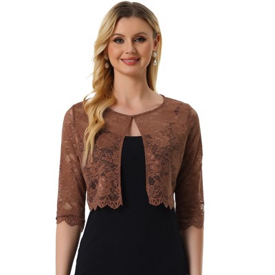 INSPIRE CHIC Women's Elegant Sheer Floral Lace Crop Cardigan Bolero Shrug Brown X-Small