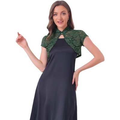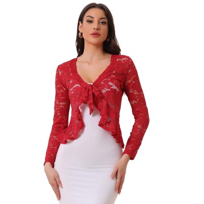 Add understated details to your formal attire with this shrug. This shrug is the perfect complement to an everyday skirt for weekend casual looks. Team it with your favorite skirt and heels for an effortlessly chic look. Add a touch of femininity to your look with a sheer floral lace shrug top. It features cap sleeves, a placket, and sheer floral lace. A flattering lace hem and beautiful floral prints add pretty detail to this women's top, which is perfect for weekday meetings or an evening out.