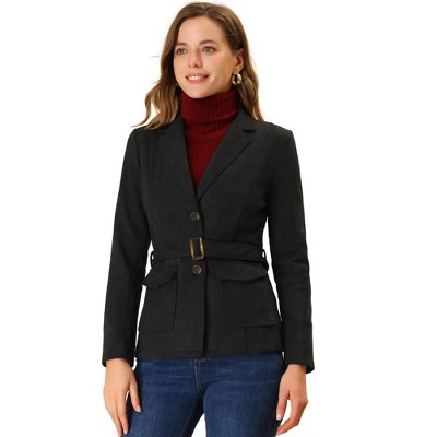 • Two Functional Flap Pockets, Notched Lapel Collar, Button Front, Belted Faux Suede Blazer for Women
