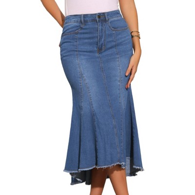Allegra K Women's Fishtail Button Front Side Pockets Midi Denim Distressed Skirt