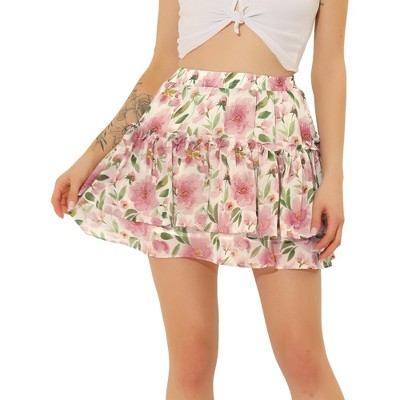 Allegra K Women's Floral Print Smocked Elastic Waist Midi Flowy Tiered Ruffle Skirt X-Large Pinks