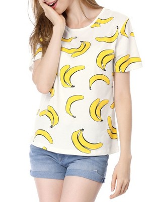 This piece with a short sleeve is cut for a comfortable, relaxed fit. Its simplistic banana print has a lightweight feel and will add a splash of color to your daytime outfits. Wear yours with shorts and sneakers. Add a splash of color to your daytime outfits with this banana tee. This banana T-shirt features a round neck, short sleeves, and an eye-catching banana print. It is suitable for daily life, picnics, and many occasions.