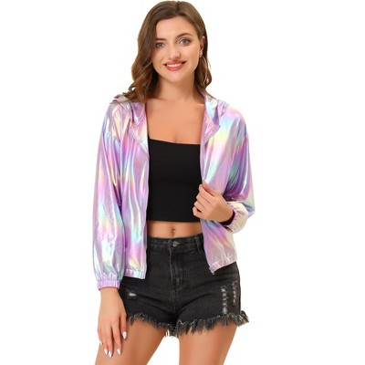 INSPIRE CHIC Women's Cropped Holographic Party Shiny Lightweight Long Sleeve Shrugs Blue Purple X-Small