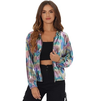 INSPIRE CHIC Women's Holographic Fashion Stand Collar Metallic Lightweight Zip Bomber Jacket X-Small Iridescent