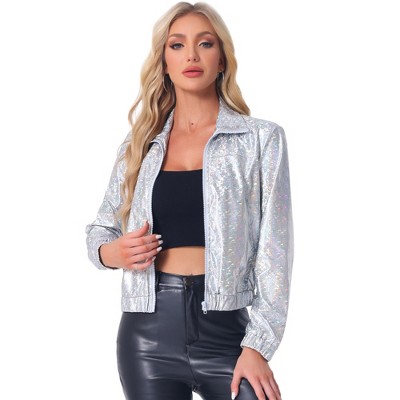 INSPIRE CHIC Women's Holographic Fashion Stand Collar Metallic Lightweight Zip Bomber Jacket Small Light Silver