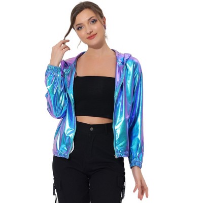 Shimmering holographic and metallic fabric is unique and shows your character. It's also outstanding among the public. Add an instant layer of partygoing charm to any look with this jacket in the shimmering metallic, which is your new warm-up must-have item. A bold metallic design lends a distinctive style to this jacket featuring a hood to stave off the breeze. This jacket can easily be worn every day with any outfit! The zipper in the jacket can also be easily dressed up or down. Simply pair it with a t-shirt or camisole and shorts for day to night, and you will be a mostly bright one.