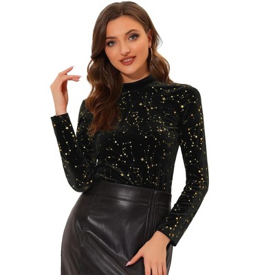 INSPIRE CHIC Women's Mesh Crop Stars Mock Neck Party See Through Blouse Black X-Small