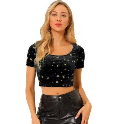 A timeless piece for your top collection. This stylish star-printed crop top will be your casual favorite. It is a must-have item for daily wear. It's cut from a stretchy and shiny fabric for a slim fit that shows your charming silhouette. Bring mesh textures into your wardrobe for the season. Portrait your body shape and look charming with a cami, a bandeau top, or a tank top inside.