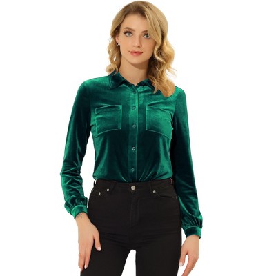 INSPIRE CHIC Women's Metallic Velvet Puff Long Sleeve Mock Neck Glitter T-shirt Dark Green Large