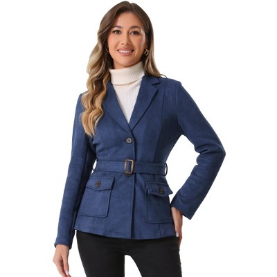 INSPIRE CHIC Women's Notch Lapel Double Breasted Belted Mid Long Outwear Winter Coat Navy Blue Small