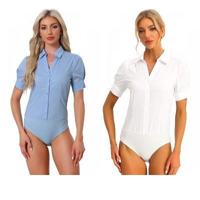 INSPIRE CHIC Women's Office Button Down One-Piece Short Sleeve Bodysuit Work Shirt