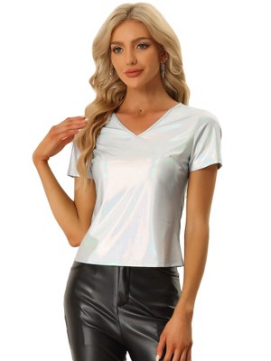 INSPIRE CHIC Women's Clubwear Short Sleeve Shiny Metallic Blouse