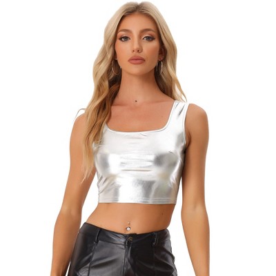 Allegra K Women's Party Metallic Short Sleeve Textured Shiny T-shirts Large Shiny Silver