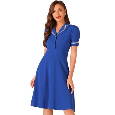 Allegra K Women's Plaid Peter Pan Collar Long Sleeve Mini A-Line Dress Large Dark Blue