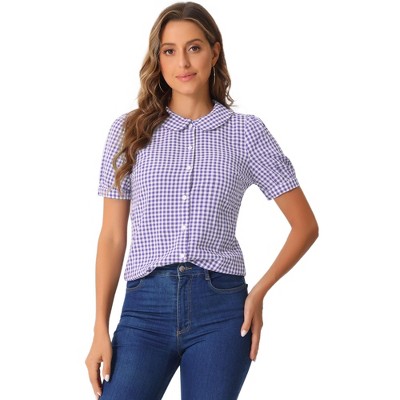 This plaid shirt is perfect for creating an ultra-feminine look with a statement peter pan collar. It's designed with puff sleeves. The plaid and full placket highlight the perfectly short sleeves with button-down of this soft and straight shirt. This cute Peter Pan collar with a lace contrast collar will make you love this shirt top.