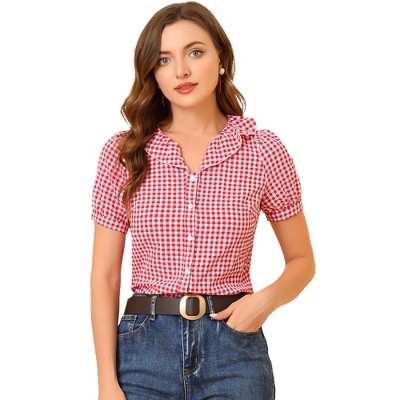 Allegra K Women's Plaid Puff Sleeves Vintage Summer Gingham Blouse